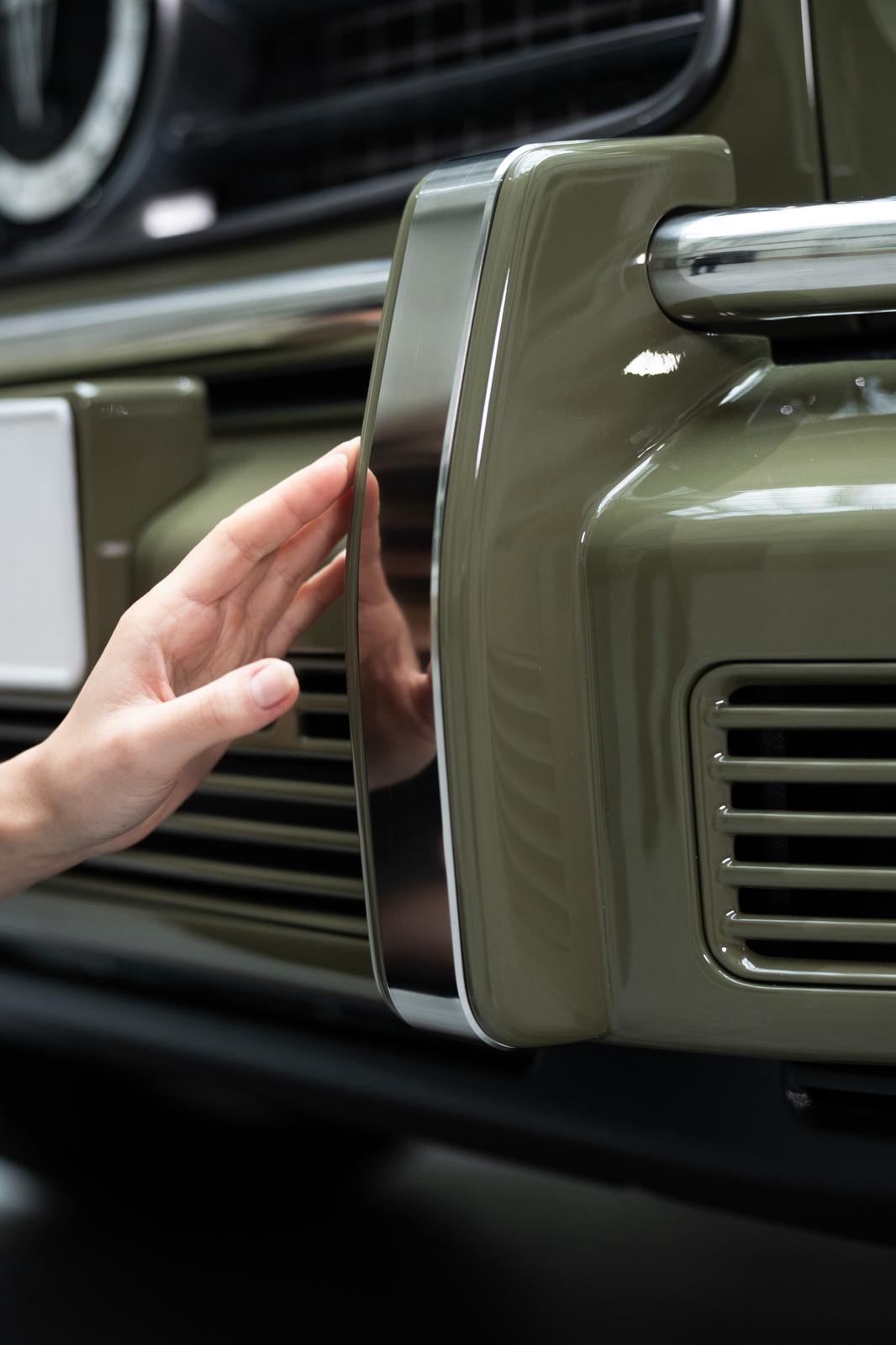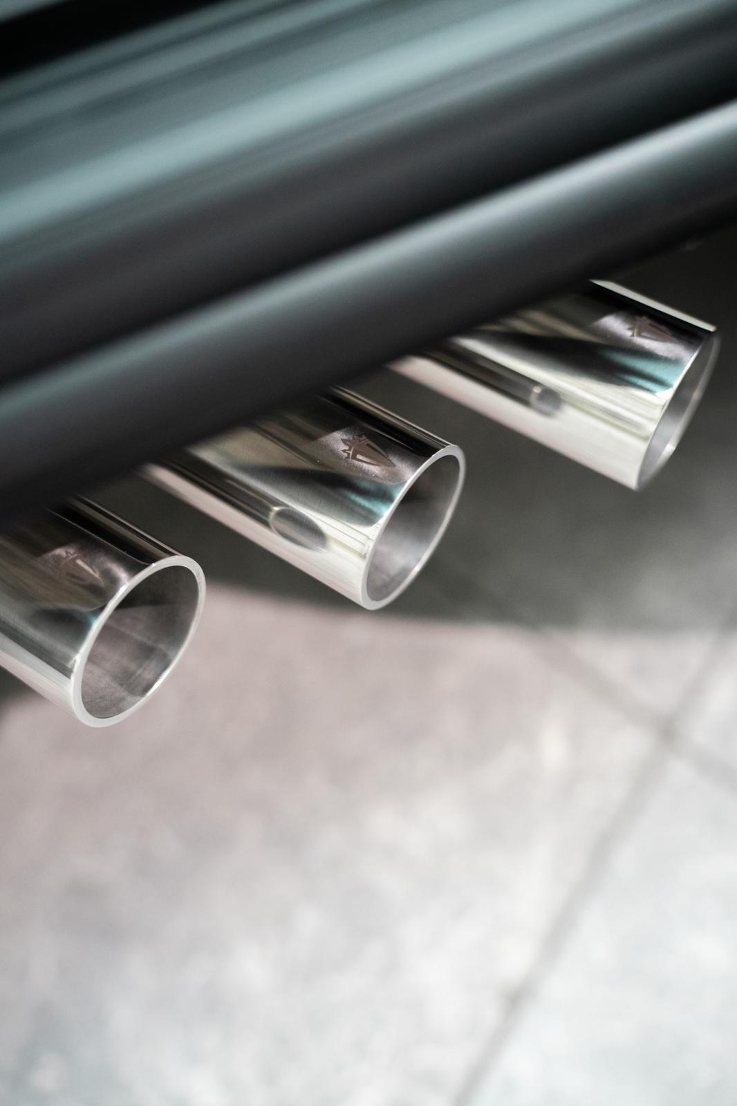 Painted carbon-fiber components blend seamlessly with the body, preserving the visual purity of the silhouette. Steel details and signature elements are finished with precision, while the two-tone composition is separated by a refined chromed line.