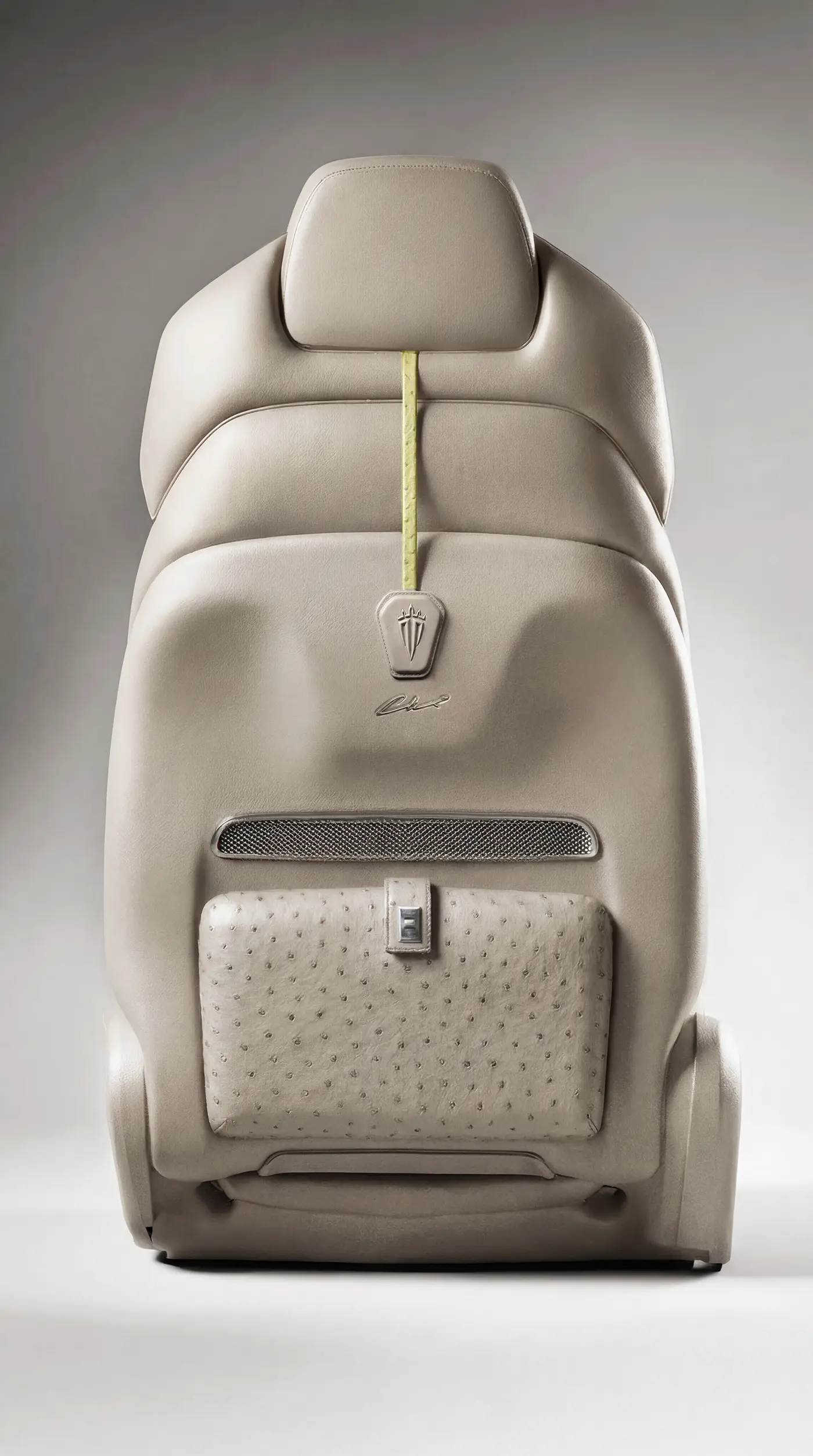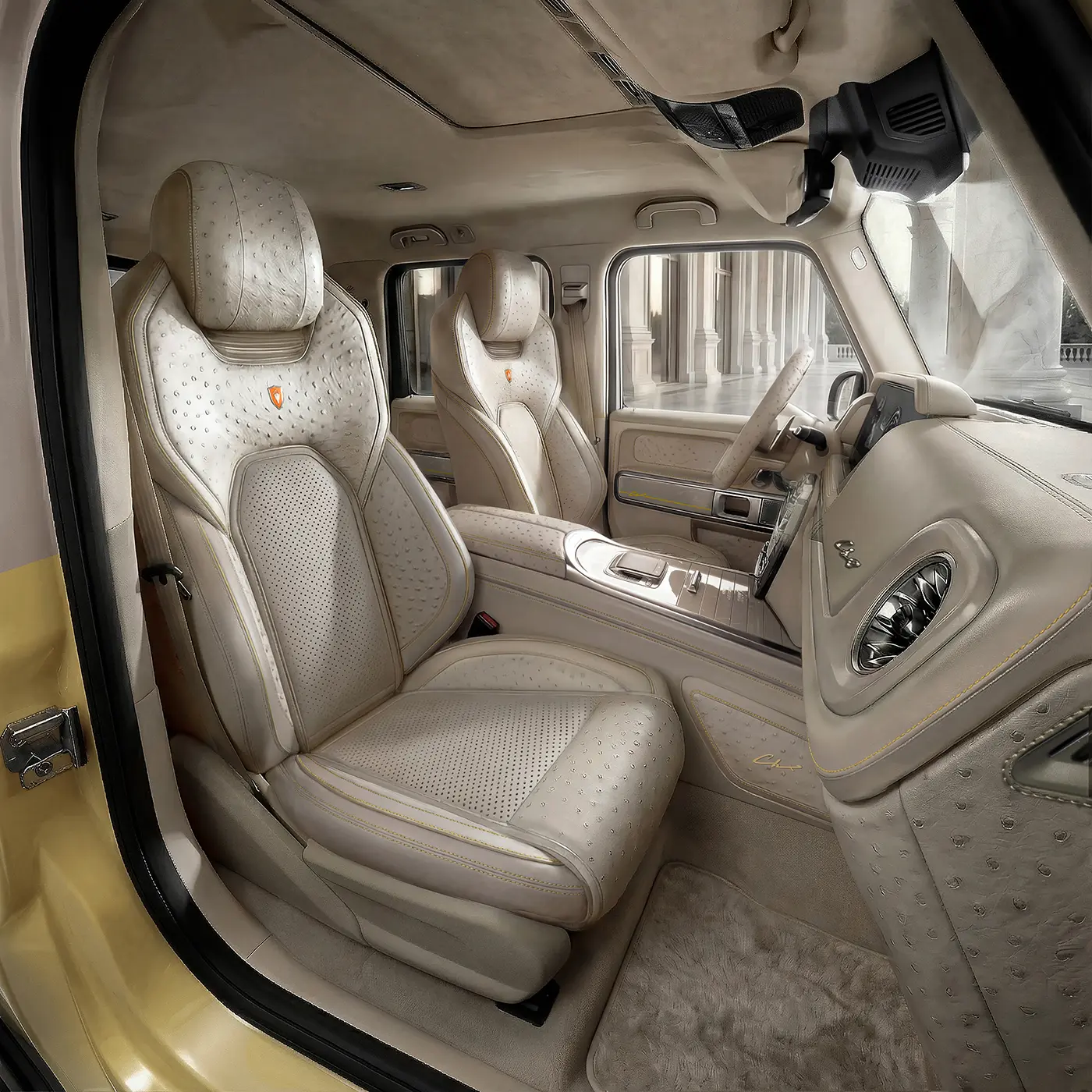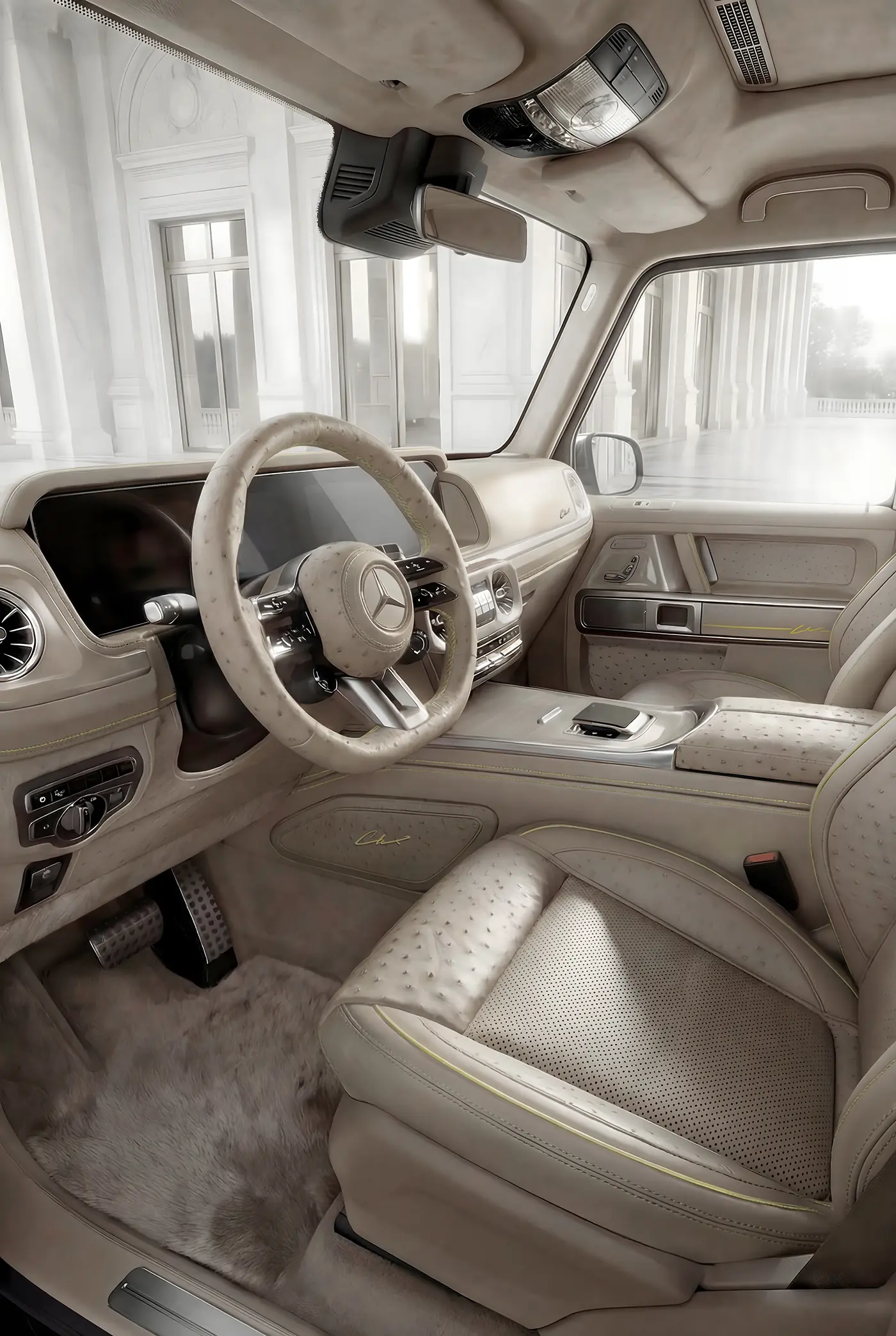 Inside, the composition becomes warmer and more tactile. The cabin is upholstered in rare ostrich leather in soft beige tones, chosen for its natural texture and refined presence.