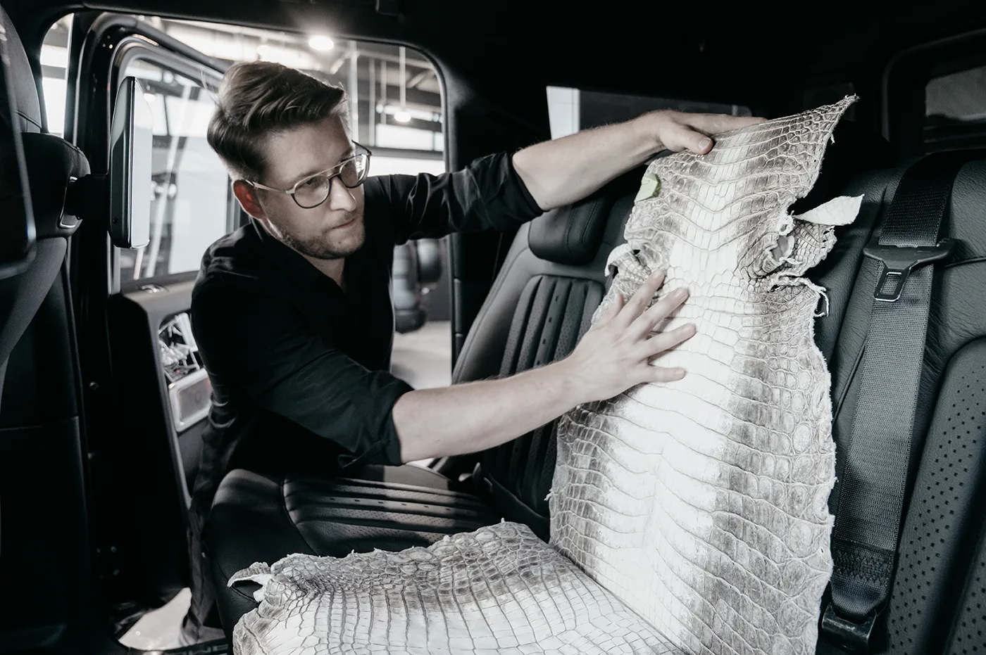 The material stops being decoration and becomes the architecture of the interior. Owning the world’s most expensive leather is not an art. Using it is. Unlike bovine leather, an alligator’s scales have a DNA — a rhythm that must be “composed”. A Carlex craftsman aligns the pattern so it flows across curves, meeting scale-to-scale on seams. This is closer to Renaissance marquetry than traditional upholstery. A millimetre of misalignment destroys a panel.